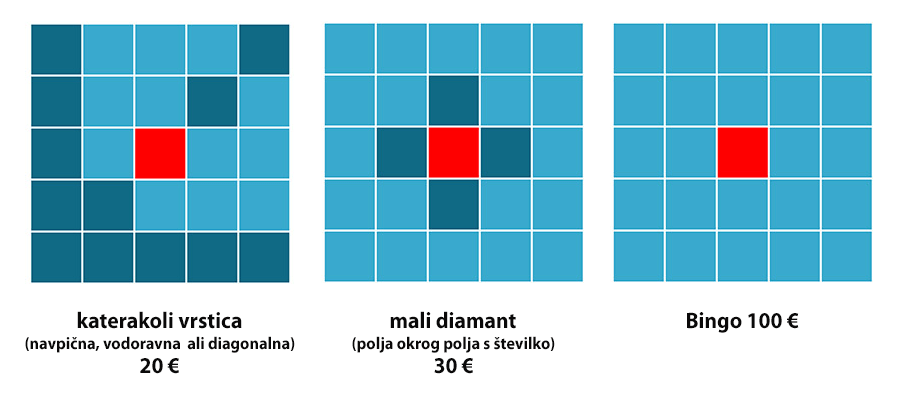 Pred končnim žrebanjem za superbingo dobitek (24 pokritih številk) se sodeluje še na dveh vmesnih žrebanjih, pri katerih poskuša igralec kar najhitreje pokriti tista polja na kartici, ki so prikazana na spodnjih skicah. Torej lahko igralec z zgolj eno kartico sodeluje na kar treh žrebanjih.